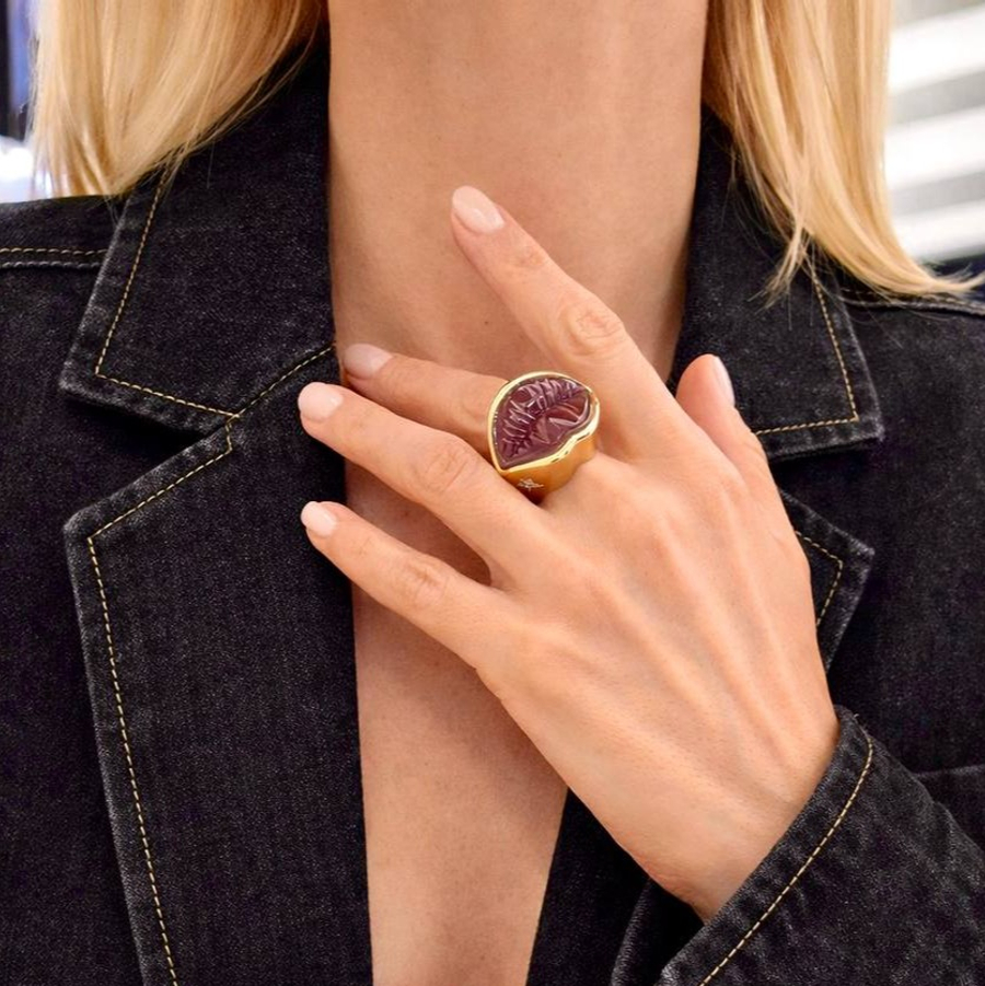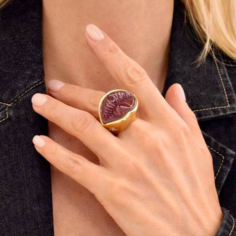 Пример: чувственное кольцо, выполненное в форме губ и воплощающее женственность. Для создания этого шедевра использовались желтое сатинированное золото 750 пробы, сердолик весом 41,10 карата и бриллианты, которыми украшена звезда.