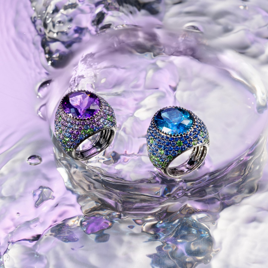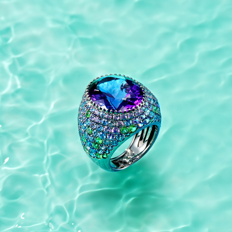Пример: кольцо из чернённого золота, украшенное аметистом, цветными сапфирами и цаворитами.