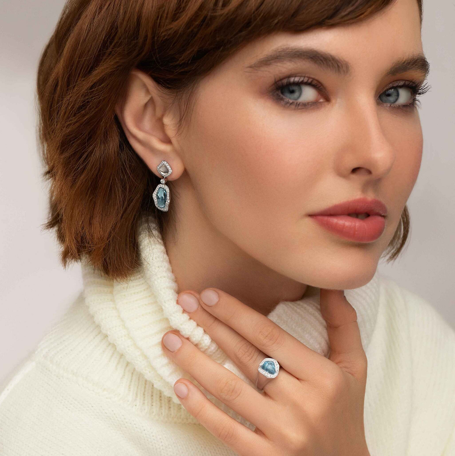 Примеры: великолепное кольцо с изумрудом огранки “груша”, и уникальные кольцо и серьги из белого золота с изумрудами, сапфирами и турмалином Параиба из коллекции RIVIERA.