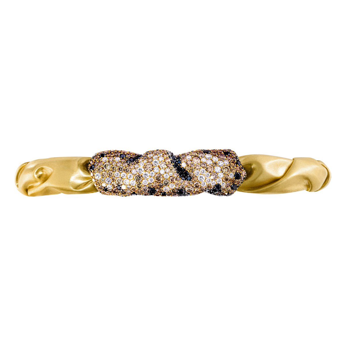 Вдохновением для этого необыкновенного украшения стали складки ткани, движущиеся на ветру. Браслет изготовлен из матового желтого золота 750 пробы, а также дополнен бриллиантами шампань, черными и белыми бриллиантами. Изысканным сочетанием цветов, текстур и форм, этот браслет является поистине запоминающимся украшением