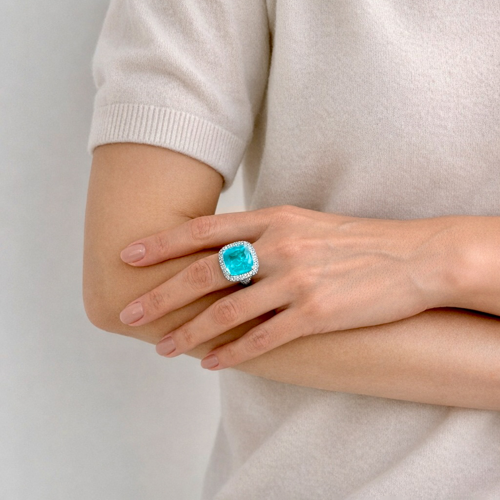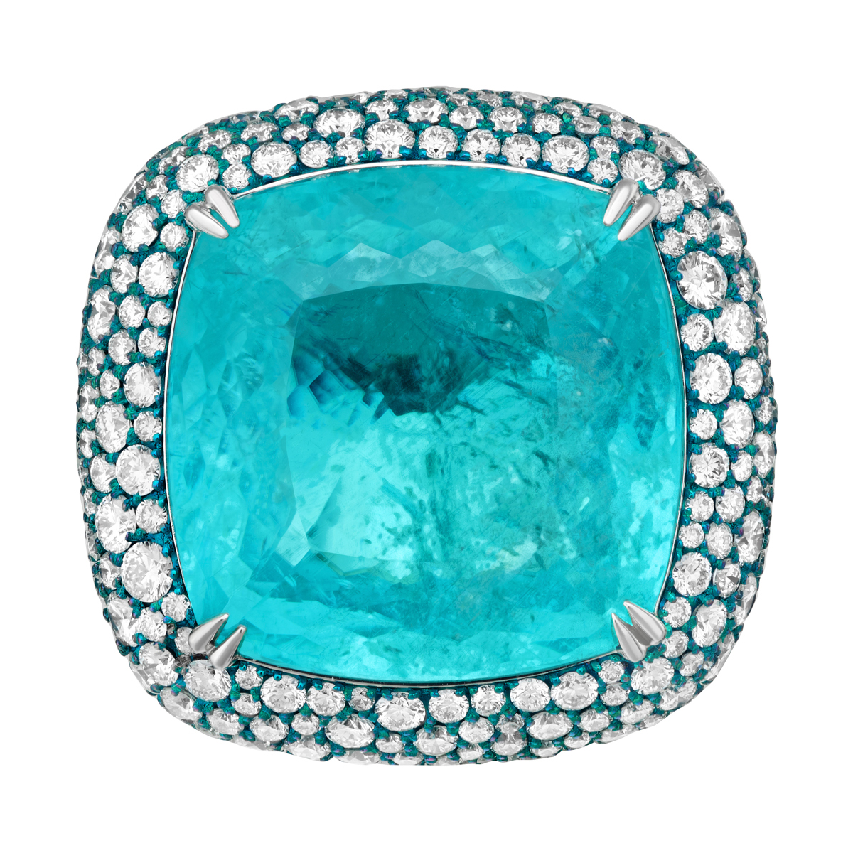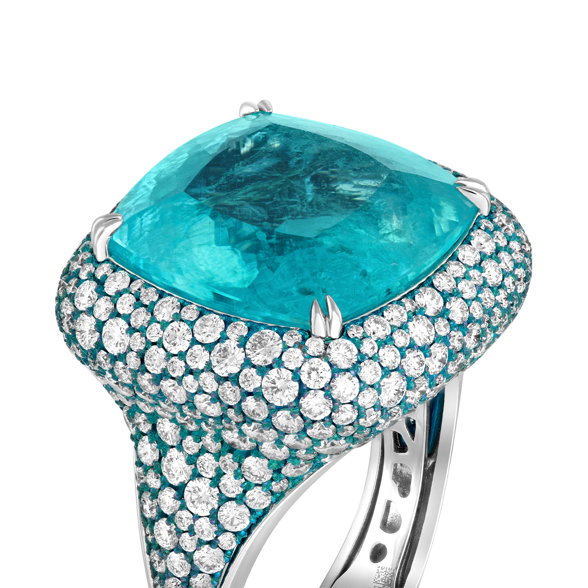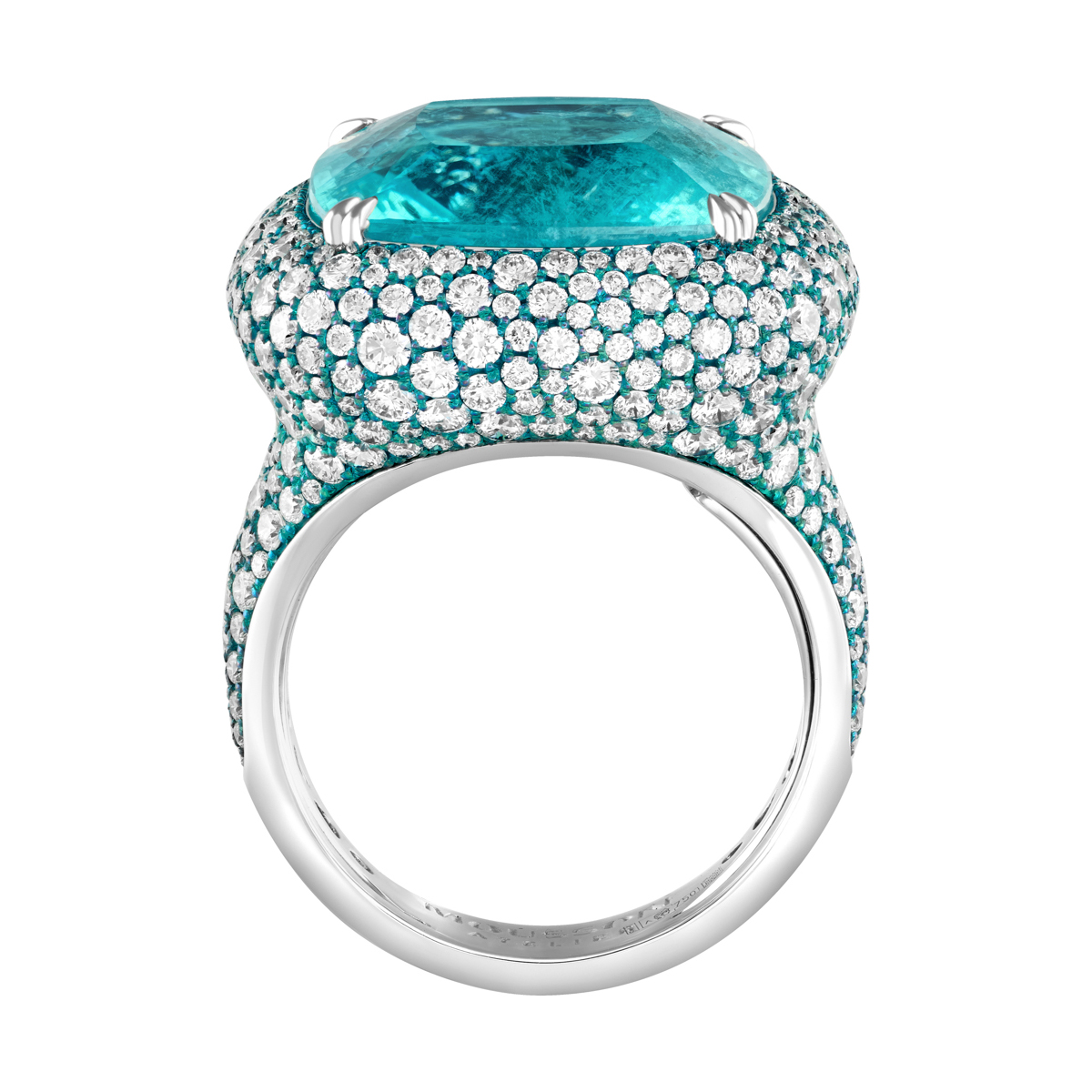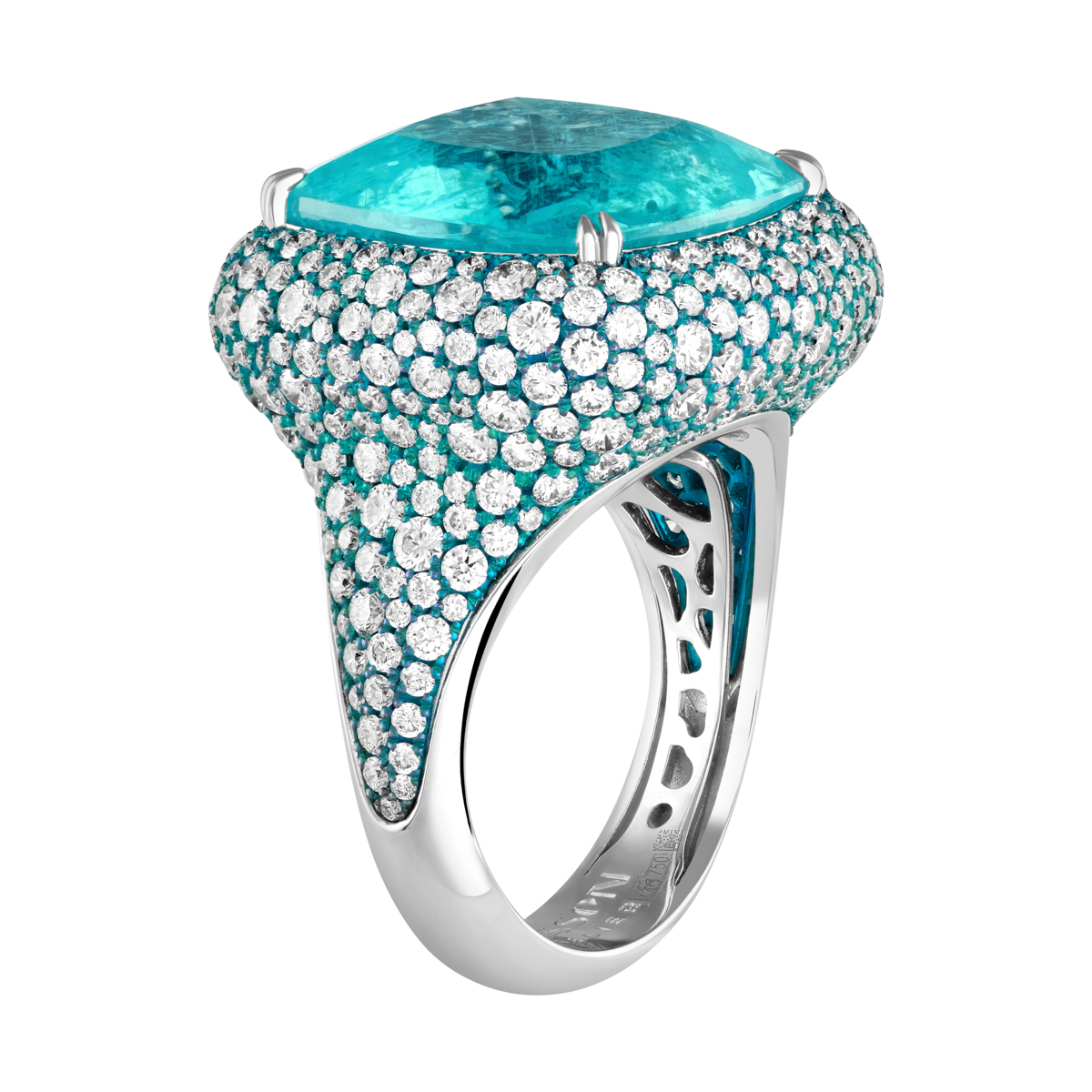 Изысканное кольцо из коллекции High Jewellery - настоящее произведение ювелирного искусства. Оно выполнено в белом золоте 750 пробы. Главным акцентом этого шедевра является внушительный турмалин Параиба огранки антик массой 15,88 карат, который завораживает своим бирюзовым оттенком. Дополняют это великолепие бриллианты весом 3,44 карата, которые подчеркивают глубину и насыщенность голубого турмалина. Каждое украшение из коллекции High Jewellery – это результат кропотливой работы лучших мастеров своего дела, что делает каждое изделие по-настоящему эксклюзивным.