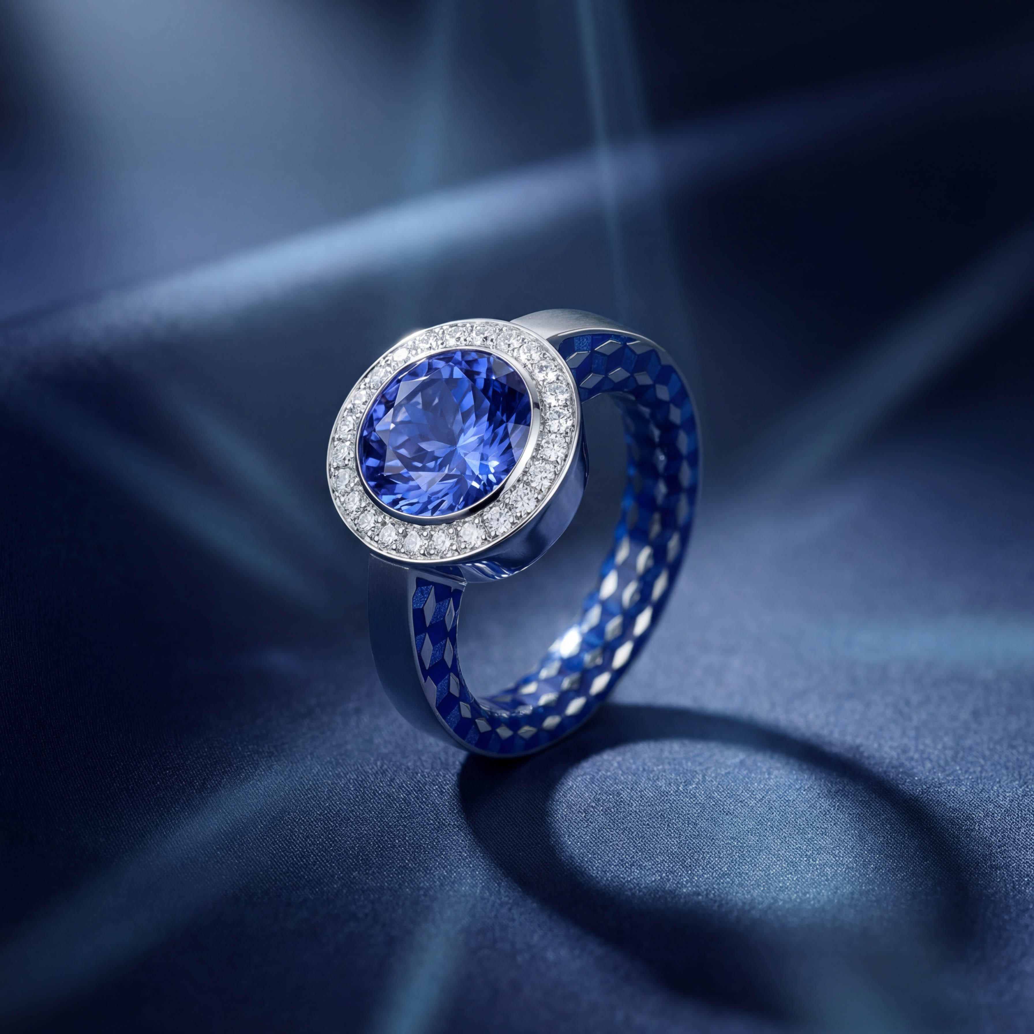 Кольцо из коллекции KALEIDOSCOPE с танзанитом и бриллиантами - идеальный аксессуар для стильных женщин. Яркий синий танзанит в сочетании с блестящими бриллиантами придадут Вашему образу особую изысканность и роскошь. Уникальная особенность коллекции KALEIDOSCOPE - орнамент в рисунке Esher на внутренней стороне изделия и цвета эмали, создаваемые вручную художником и гармонирующие с оттенком камня.