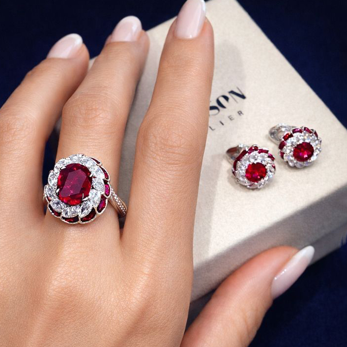 Центральный рубин дополнен рубинами огранки груша, а также бриллиантами общим весом 1,86 карата. Сочетание разных форм и пропорций создаёт динамичную архитектуру, в которой глубина красного цвета уравновешена чистым светом бриллиантов.