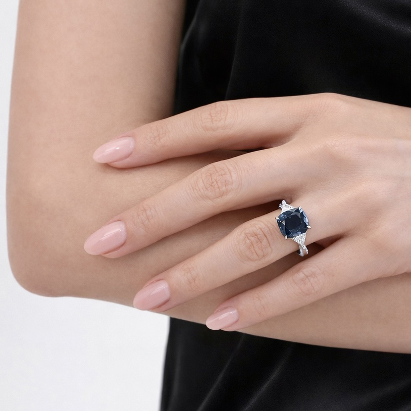 Представляем вашему вниманию уникальное кольцо из коллекции HIGH JEWELLERY! Это украшение воплощает истинную роскошь благодаря синей шпинели весом 6,57 карата и двум сверкающим бриллиантам общим весом 0,48 карата. Благородный металл -  белое золото 750 пробы - идеально подчеркивает великолепие камней, создавая непревзойденную игру света. Вес кольца составляет всего 6,93 граммов, что делает его удивительно легким и комфортным при ношении даже каждый день. Выбирайте это кольцо, чтобы добавить нотку элегантности своему стилю и стать обладательницей настоящего произведения ювелирного искусства.