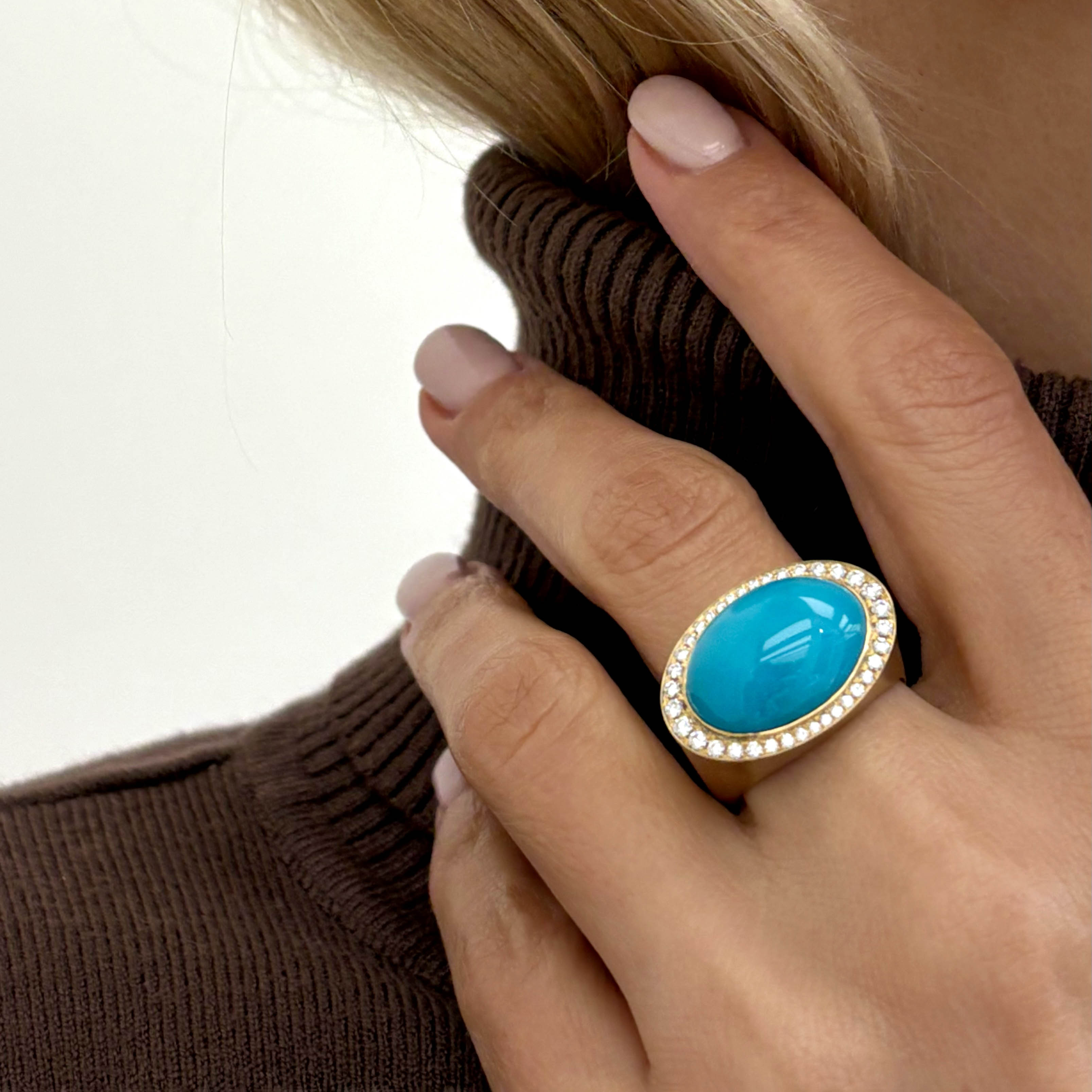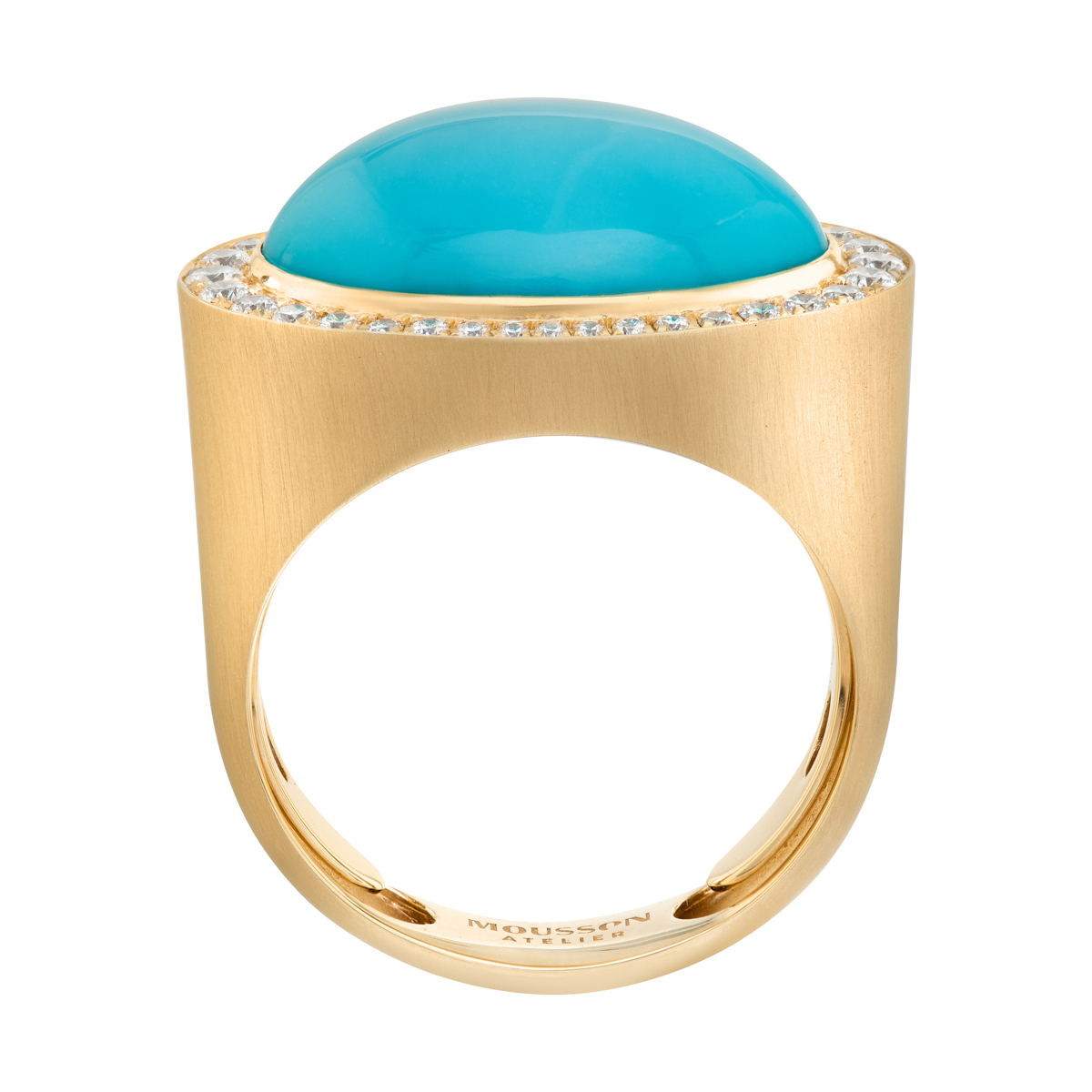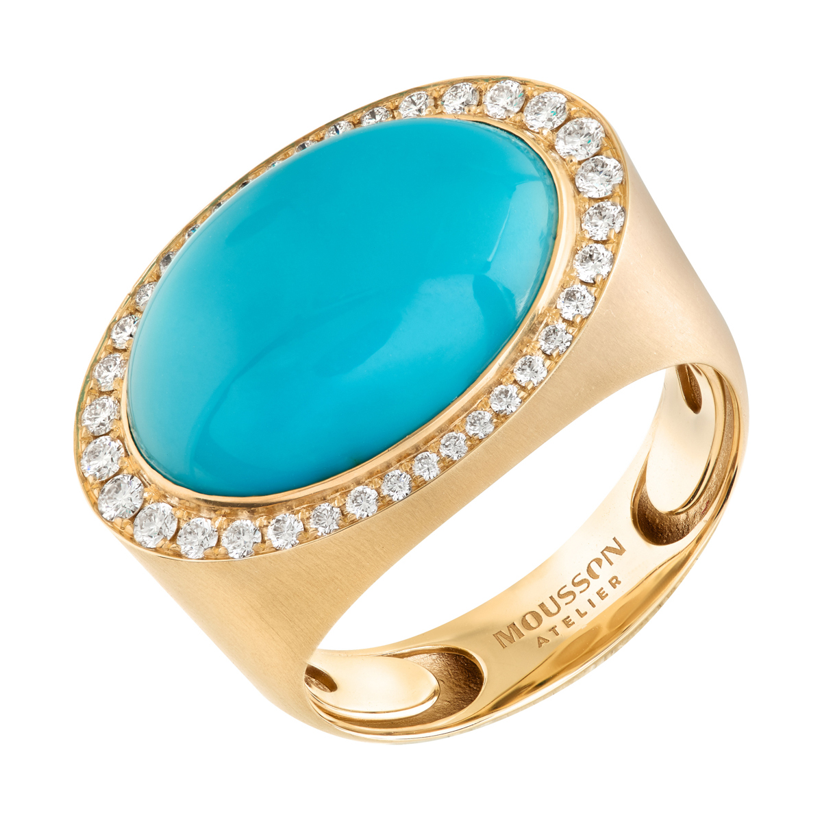Кольцо сочетает магию бирюзы и элегантность бриллиантов. Элегантная комбинация усиливается благодаря использованию желтого сатинированного золота 750 пробы. Идеально подходит как подарок к особому событию.