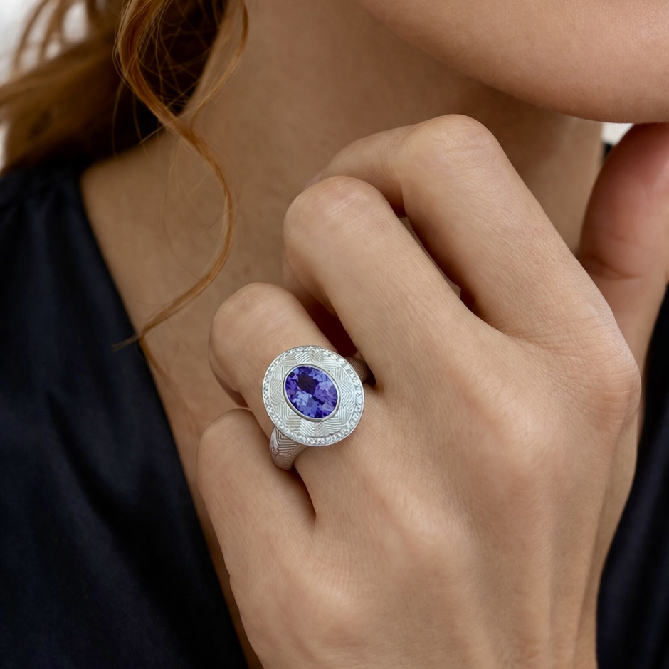 Представляем вашему вниманию роскошное кольцо из коллекции TWEED, созданное лучшими ювелирами нашей компании! Текстура изделий из коллекции Tweed напоминает известную ткань, но главное, она напоминает старинную технику Фаберже - гильоширование, в более точном визуальном и технологическом исполнении. Кольцо выполнено из белого золота 750 пробы, в середине закреплен овальной формы сине-фиолетовый танзанит весом 1,48 карата, а вокруг него расположены белые блестящие бриллианты.