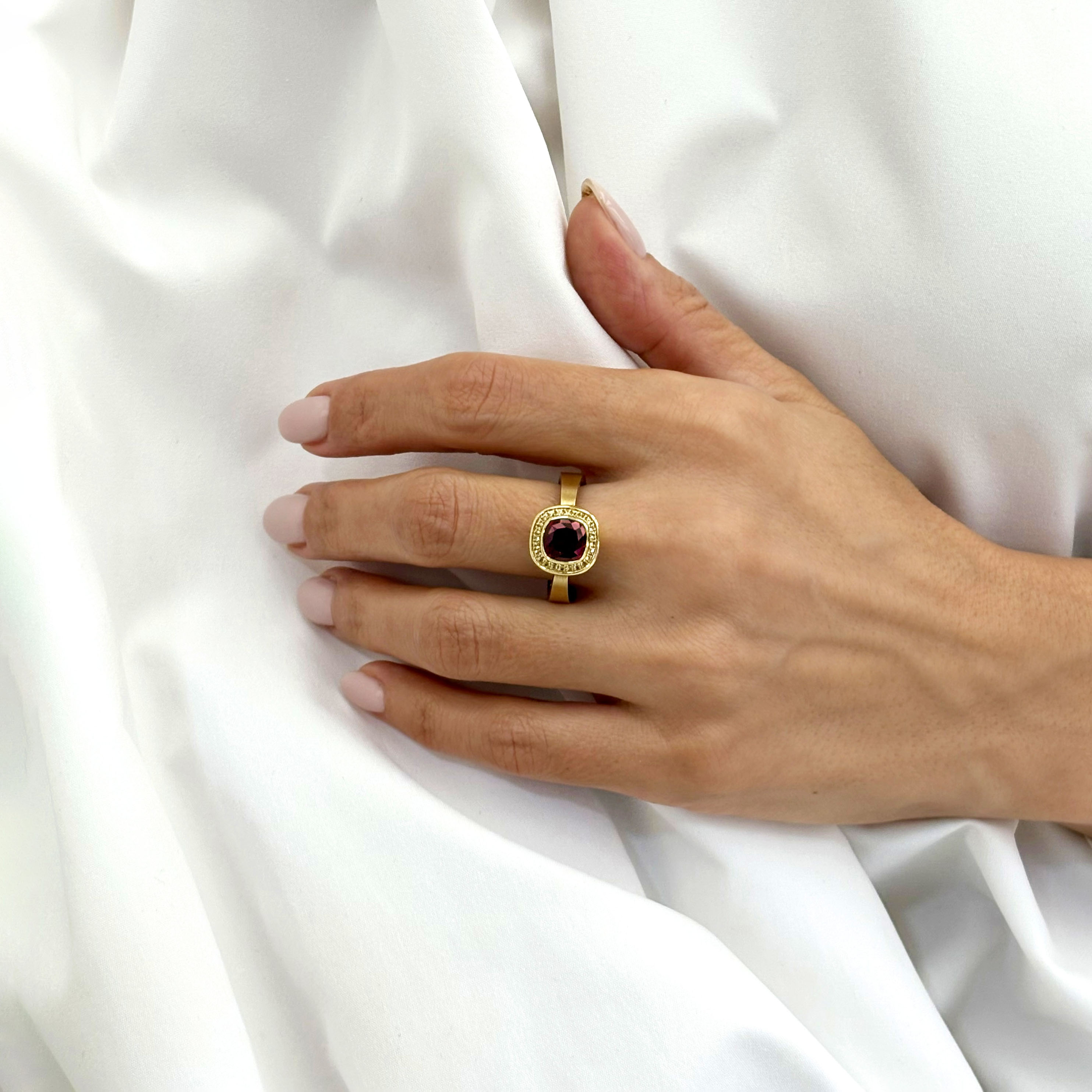 Кольцо с гранатом и рубинами из коллекции KALEIDOSCOPE - яркий акцент для стильных женщин. Уникальная особенность этой коллекции - цвет эмали внутри изделия создается вручную художником и сочетается с цветом камня. Главным акцентом кольца является роскошный гранат весом 2,65 карата в огранке антик, который благодаря своей форме красиво играет светом при любом освещении. Дополняют композицию рубины общим весом 0,44 карата, которые гармонично подчеркивают насыщенный оттенок основного камня. Вес всего изделия составляет 13,37 грамм. Такое кольцо станет прекрасным дополнением к любому образу современной женщины и предоставит возможность выделиться в любой компании!