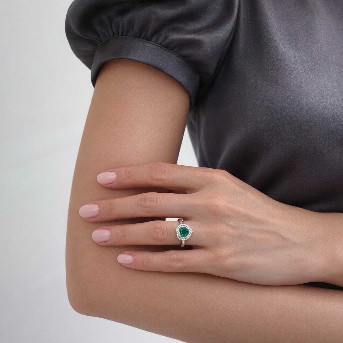 Уникальное кольцо выполнено из белого и жёлтого золота 750 пробы. Изысканный изумруд в огранке сердце насыщенного зеленого оттенка гармонично сочетается со сверкающими бриллиантами, создавая истинную драгоценность. Созданное специально для женщин, это кольцо символизирует подлинную любовь и красоту.